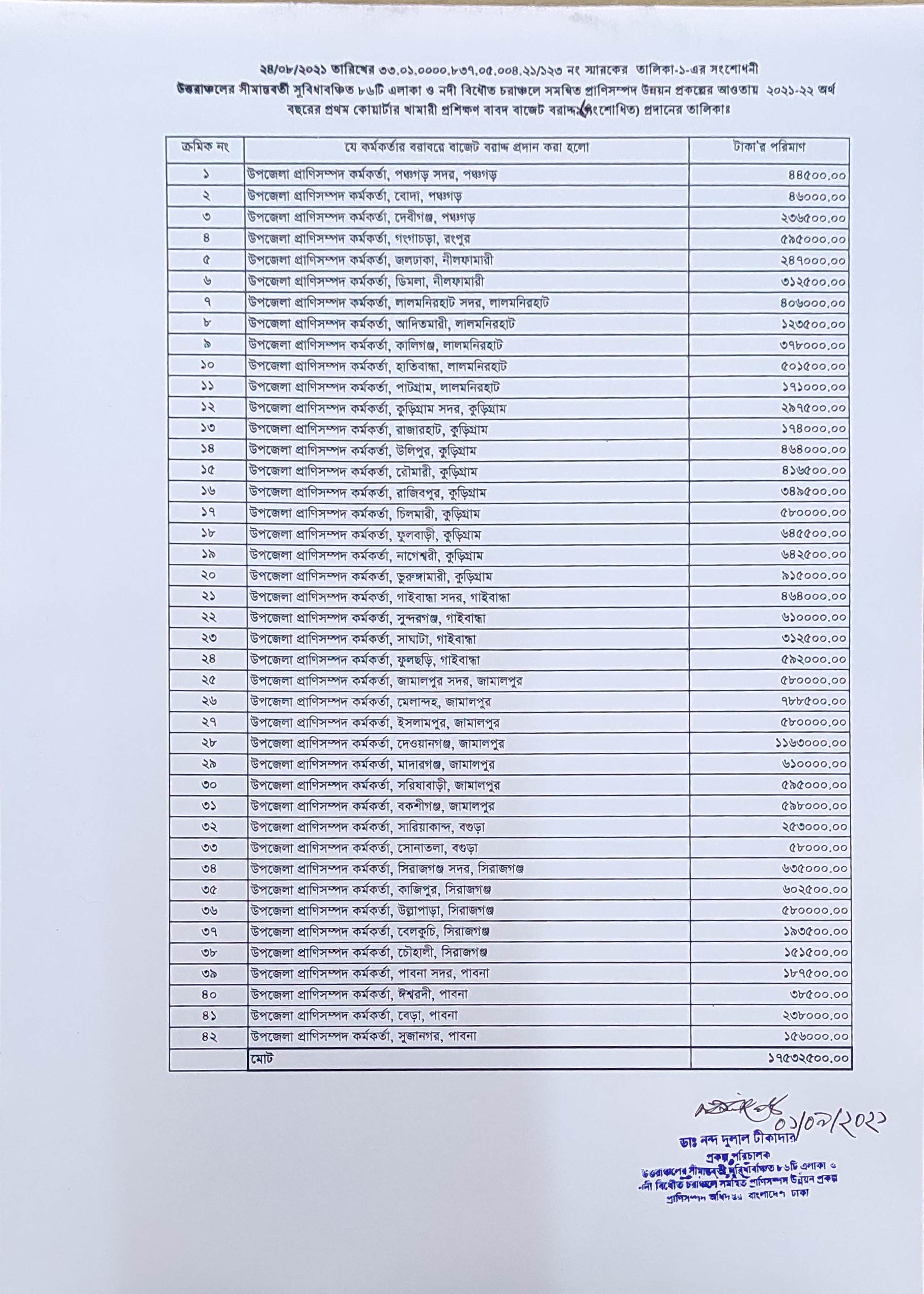 ০৯. ৮৬ টি ছিটমহলে সমন্বিত প্রাণিসম্পদ উন্নয়ন প্রকল্পের খামারী প্রশিক্ষণ বাবদ ২য় কিস্তির বাজেট বরাদ্দ